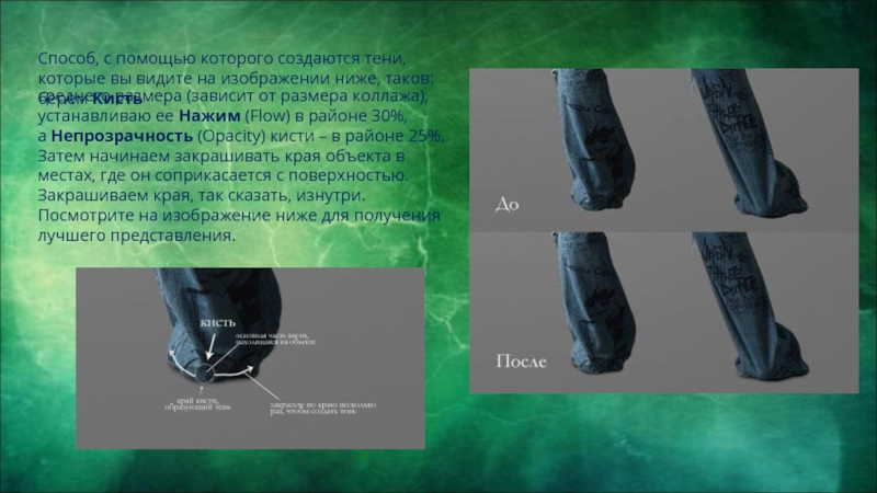 устанавливаю ее Нажим (Flow) в районе 30%, а Непрозрачность (Opacity) кисти – в районе 25%. Затем начинаем закрашивать края объекта в местах, где он соприкасается с поверхностью. Закрашиваем края, так сказать, изнутри. Посмотрите на изображение ниже для получения лучшего представления.