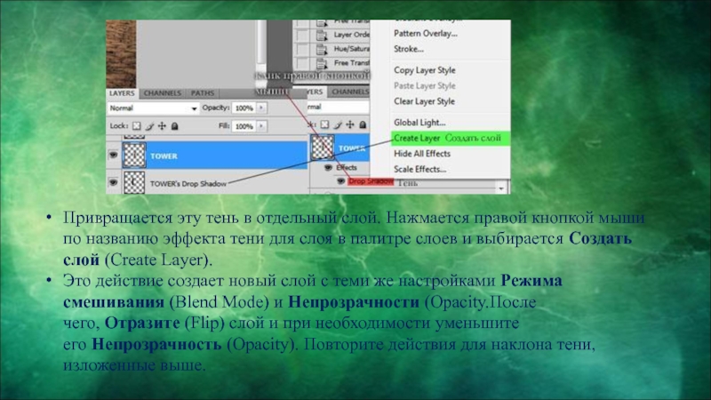 Слайд 12Привращается эту тень в отдельный слой. Нажмается правой кнопкой мыши