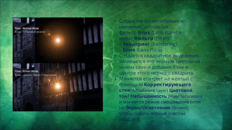 Слайд 15Создается заключительное свечение, используя фильтр Блик (Lens Flare) в меню Фильтр (Filter) – Рендеринг (Rendering) – Блик (Lens