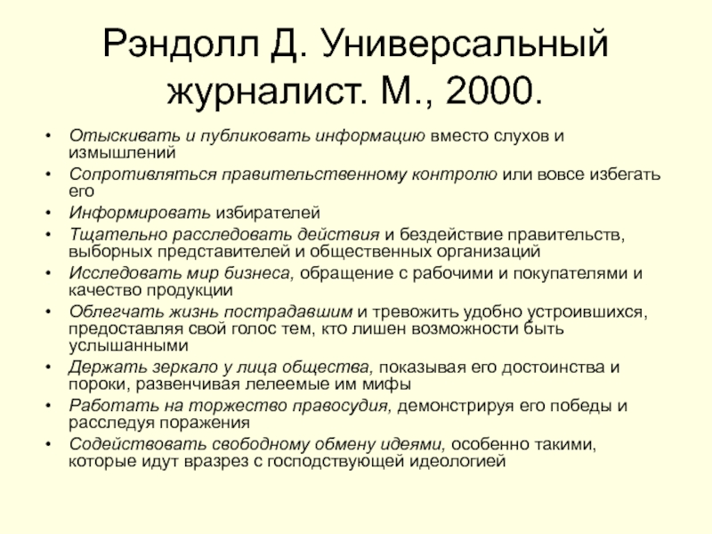 Слайд 19Рэндолл Д. Универсальный журналист. М., 2000.