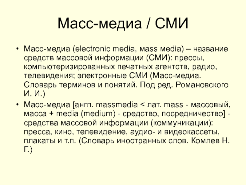 СМИ (Масс-медиа. Словарь терминов и понятий. Под ред. Романовского И. И.)