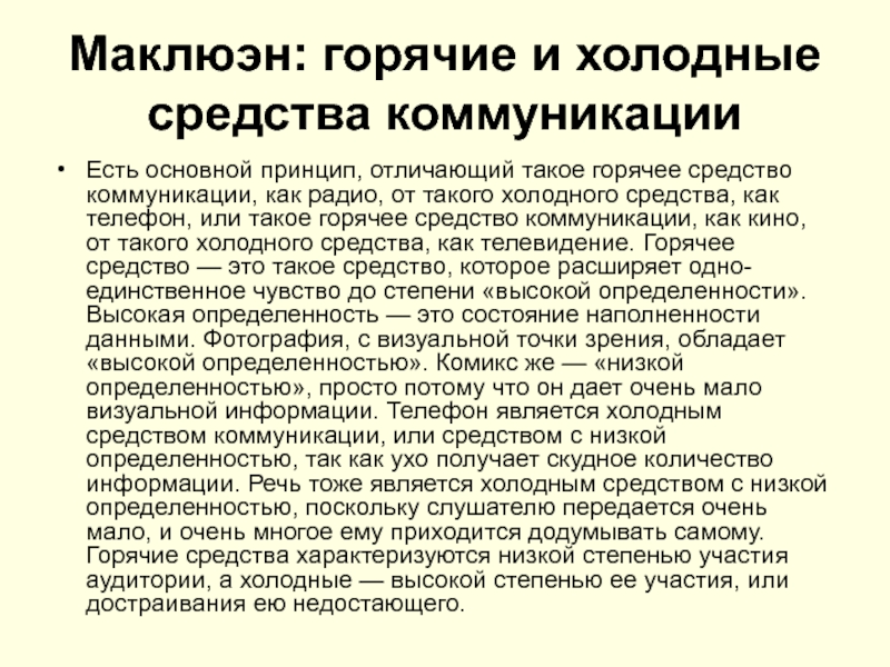 телефон, или такое горячее средство коммуникации, как кино, от такого холодного средства, как телевидение. Горячее средство — это такое средство, которое расширяет одно-единственное чувство до степени «высокой определенности». Высокая определенность — это состояние наполненности данными. Фотография, с визуальной точки зрения, обладает «высокой определенностью». Комикс же — «низкой определенностью», просто потому что он дает очень мало визуальной информации. Телефон является холодным средством коммуникации, или средством с низкой определенностью, так как ухо получает скудное количество информации. Речь тоже является холодным средством с низкой определенностью, поскольку слушателю передается очень мало, и очень многое ему приходится додумывать самому. Горячие средства характеризуются низкой степенью участия аудитории, а холодные — высокой степенью ее участия, или достраивания ею недостающего.