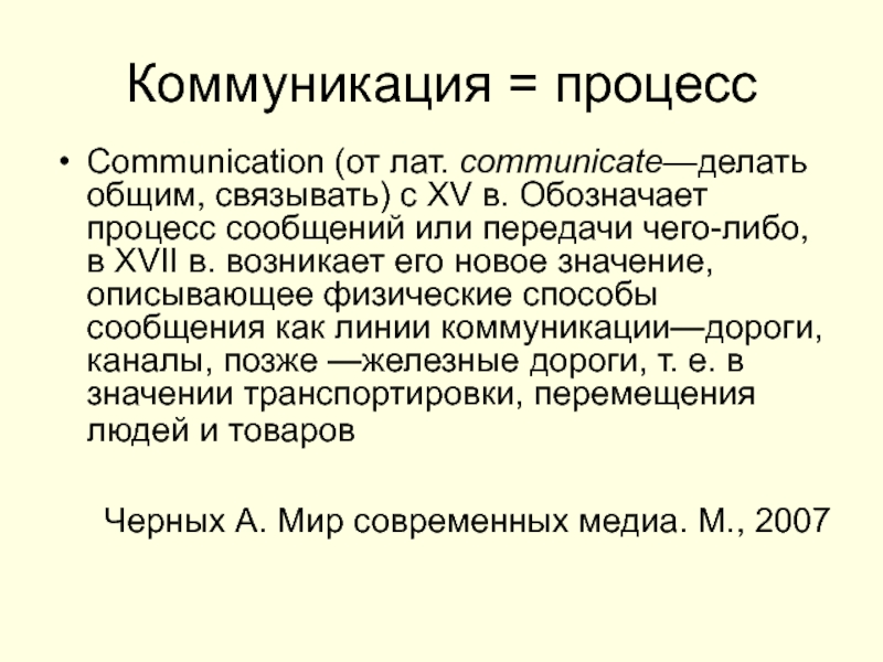XV в. Обозначает процесс сообщений или передачи чего-либо, в XVII