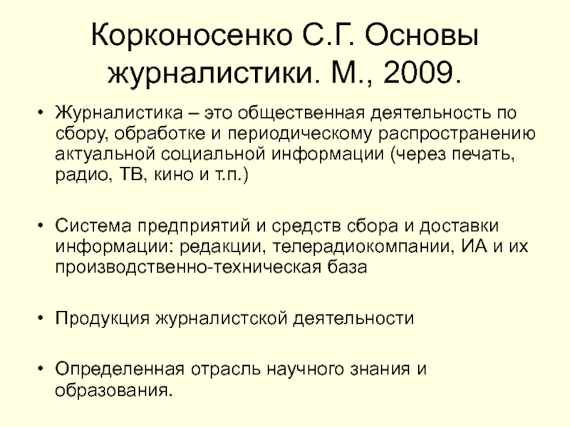 Слайд 18Корконосенко С.Г. Основы журналистики. М., 2009.