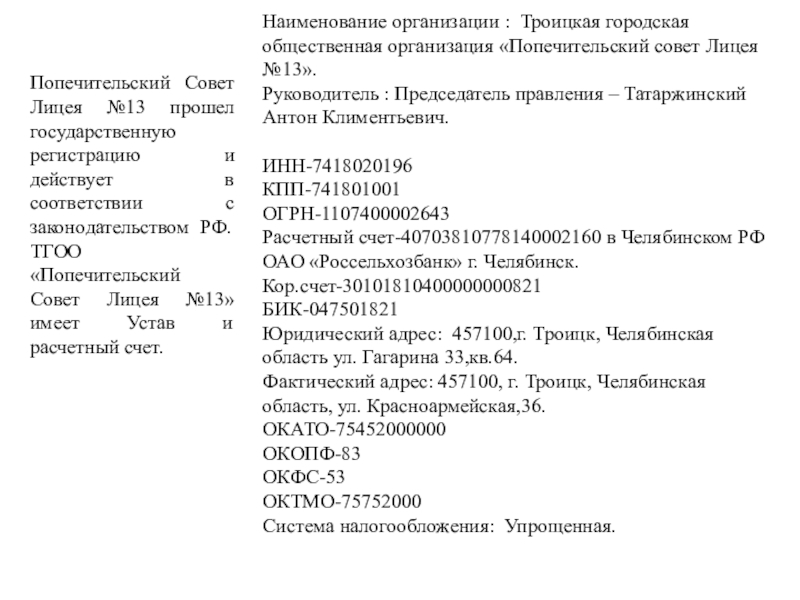 Наименование организации : Троицкая городская общественная организация «Попечительский совет Лицея №13».