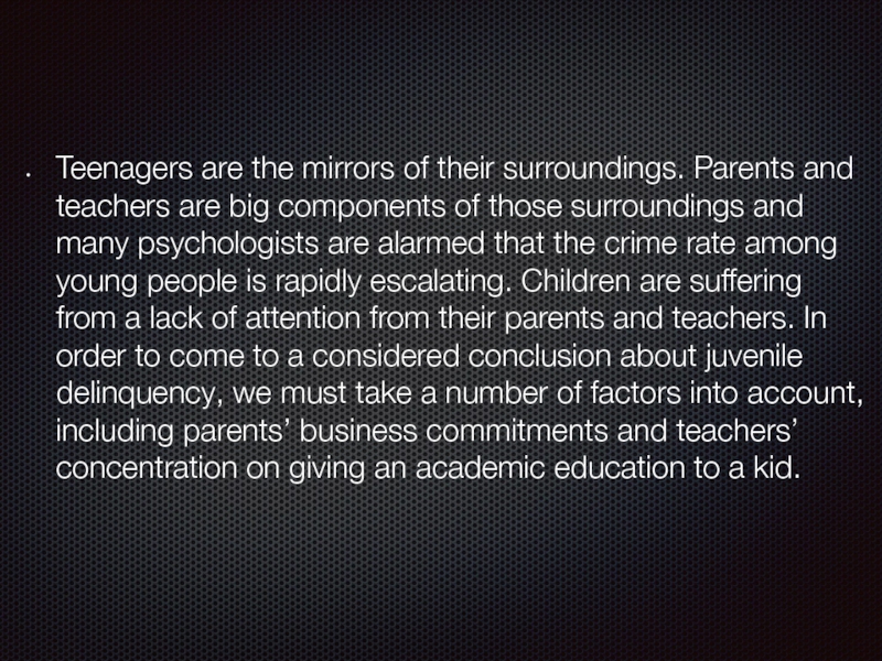 alarmed that the crime rate among young people is rapidly escalating. Children are suffering from a lack of attention from their parents and teachers. In order to come to a considered conclusion about juvenile delinquency, we must take a number of factors into account, including parents’ business commitments and teachers’ concentration on giving an academic education to a kid.