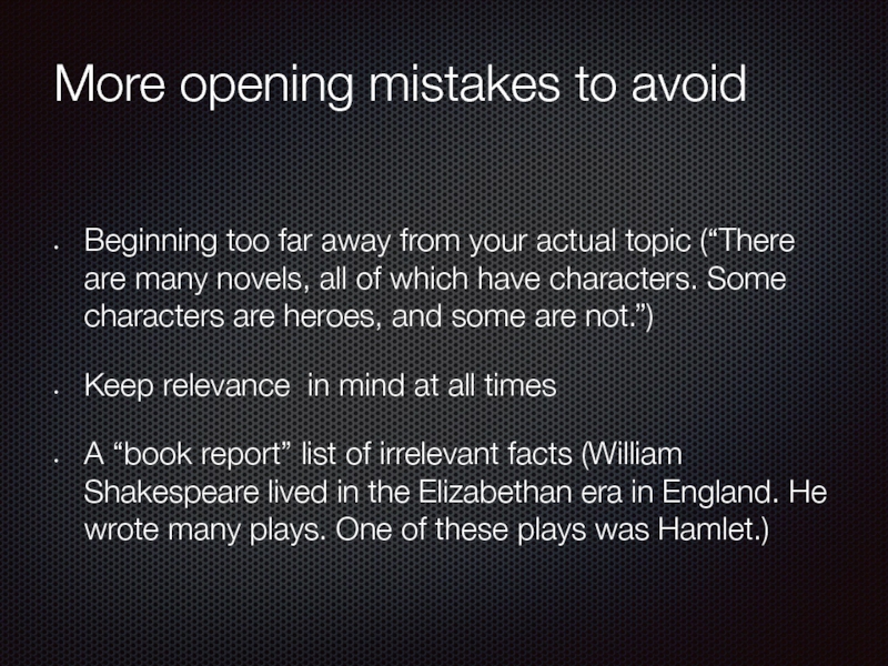 A “book report” list of irrelevant facts (William Shakespeare lived in the Elizabethan era in England. He wrote many plays. One of these plays was Hamlet.)