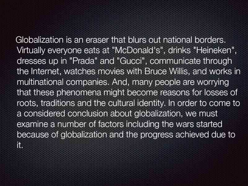 in "Prada" and "Gucci", communicate through the Internet, watches movies with Bruce Willis, and works in multinational companies. And, many people are worrying that these phenomena might become reasons for losses of roots, traditions and the cultural identity. In order to come to a considered conclusion about globalization, we must examine a number of factors including the wars started because of globalization and the progress achieved due to it.