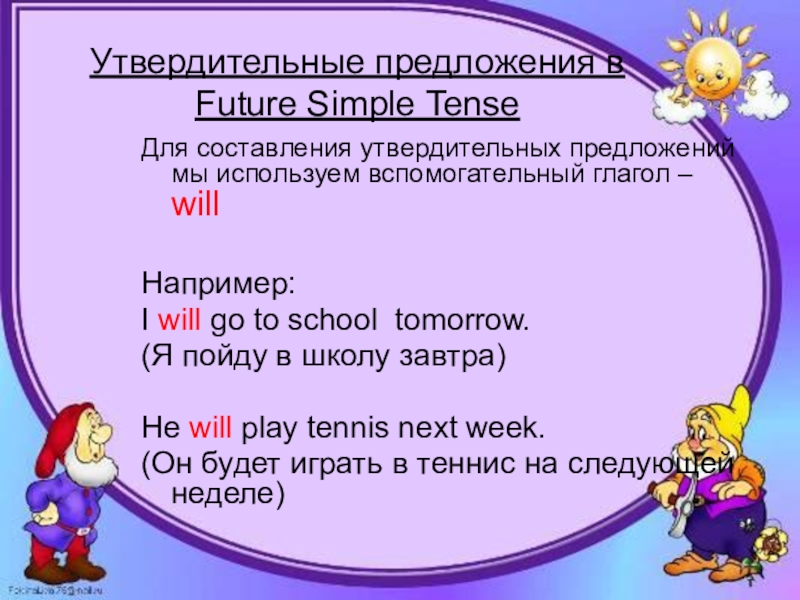 Слайд 4Утвердительные предложения в Future Simple Tense