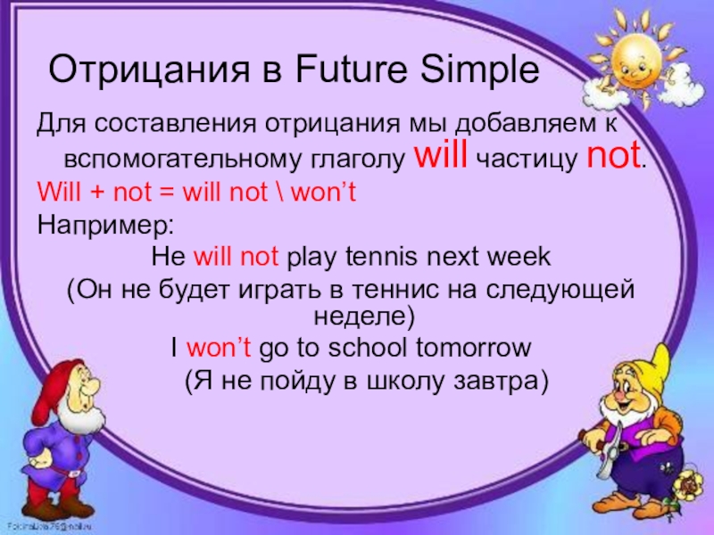 Отрицания в Future SimpleДля составления отрицания мы добавляем к вспомогательному глаголу will частицу not.Will + not =