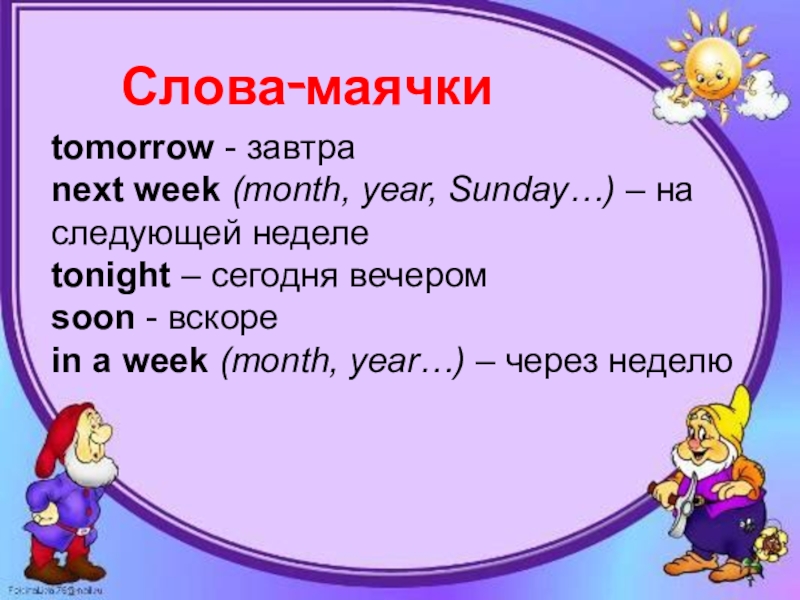 tomorrow - завтраnext week (month, year, Sunday…) – на следующей неделеtonight – сегодня вечеромsoon - вскореin a week (month, year…) – через неделюСлова-маячки