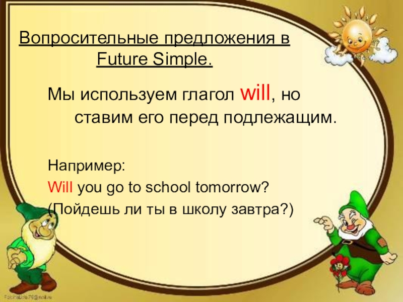 Вопросительные предложения в Future Simple.Мы используем глагол will, но ставим его перед подлежащим.Например:Will you go to school