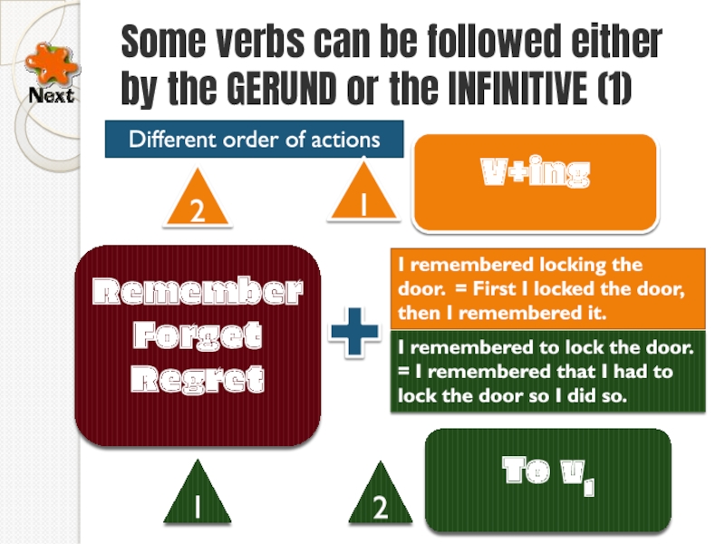 I remembered to lock the door. = I remembered that I had to lock the door so I did so.