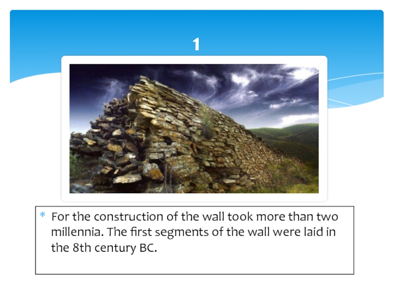 subdue longstanding blood feud. He was proclaimed the first Chinese Emperor and for 11 years of his reign, created the state with an effective system of governance and justice. It was his idea to combine already existing in the North of the Empire fortifications a single wall. Start of construction