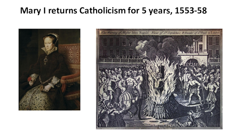 Слайд 23Mary I returns Catholicism for 5 years, 1553-58