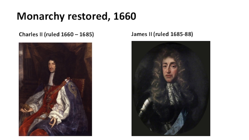 Monarchy restored, 1660Charles II (ruled 1660 – 1685)James II (ruled 1685-88)