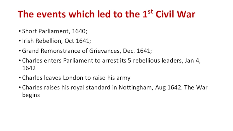 The events which led to the 1st Civil WarShort Parliament, 1640;Irish Rebellion, Oct 1641;Grand Remonstrance of Grievances,