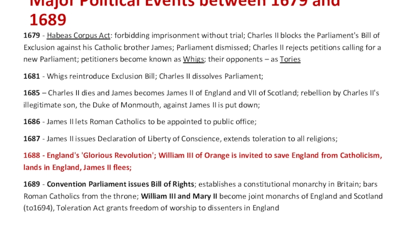 Major Political Events between 1679 and 16891679 - Habeas Corpus Act: forbidding imprisonment without trial; Charles II