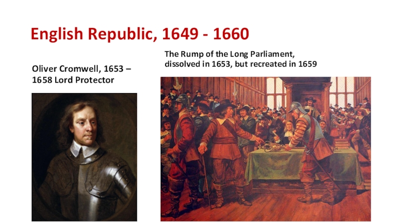 English Republic, 1649 - 1660Oliver Cromwell, 1653 – 1658 Lord ProtectorThe Rump of the Long Parliament, dissolved