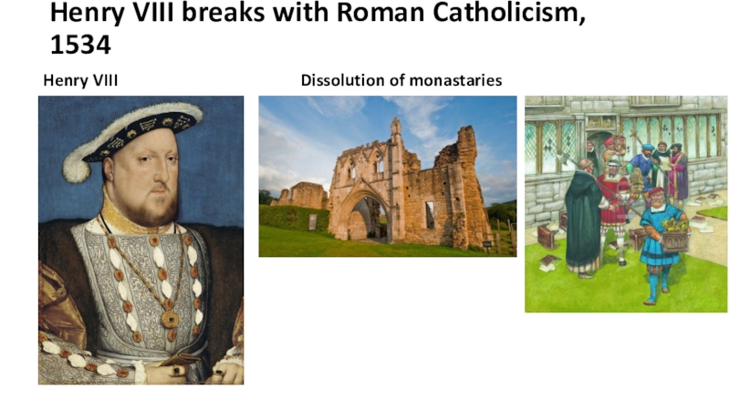 Henry VIII breaks with Roman Catholicism, 1534 Henry VIIIDissolution of monastaries
