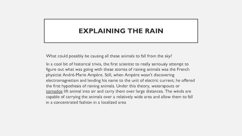 historical trivia, the first scientist to really seriously attempt to figure out what was going with these stories of raining animals was the French physicist André-Marie Ampère. Still, when Ampère wasn't discovering electromagnetism and lending his name to the unit of electric current, he offered the first hypothesis of raining animals. Under this theory, waterspouts or tornados lift animal into air and carry them over large distances. The winds are capable of carrying the animals over a relatively wide area and allow them to fall in a concentrated fashion in a localized area