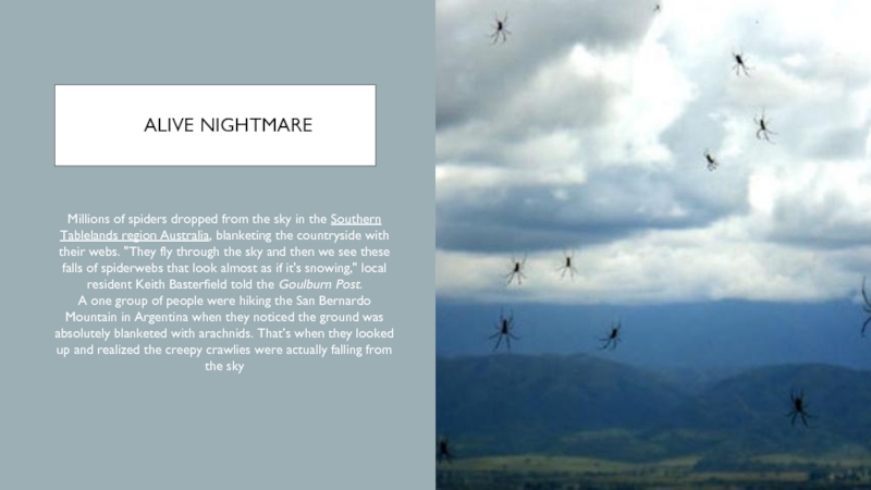 ALIVE NIGHTMAREMillions of spiders dropped from the sky in the Southern Tablelands region Australia, blanketing the countryside