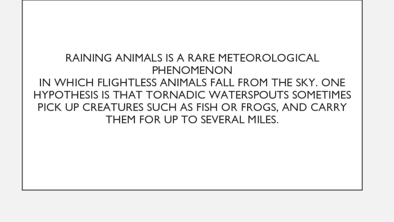 Слайд 3Raining animals is a rare meteorological phenomenon in which flightless animals