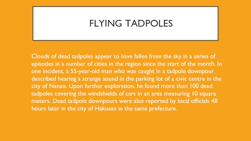 of cities in the region since the start of the month. In one incident, a 55-year-old man who was caught in a tadpole downpour described hearing a strange sound in the parking lot of a civic centre in the city of Nanao. Upon further exploration, he found more than 100 dead tadpoles covering the windshields of cars in an area measuring 10 square meters. Dead tadpole downpours were also reported by local officials 48 hours later in the city of Hakusan in the same prefecture.