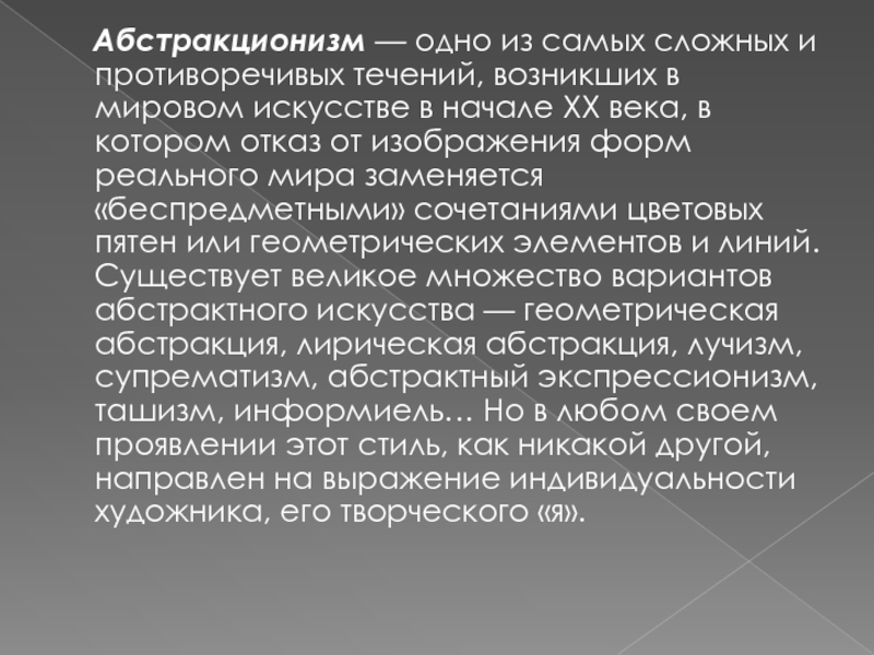 Абстракционизм — одно из самых сложных и противоречивых течений, возникших в мировом искусстве в начале