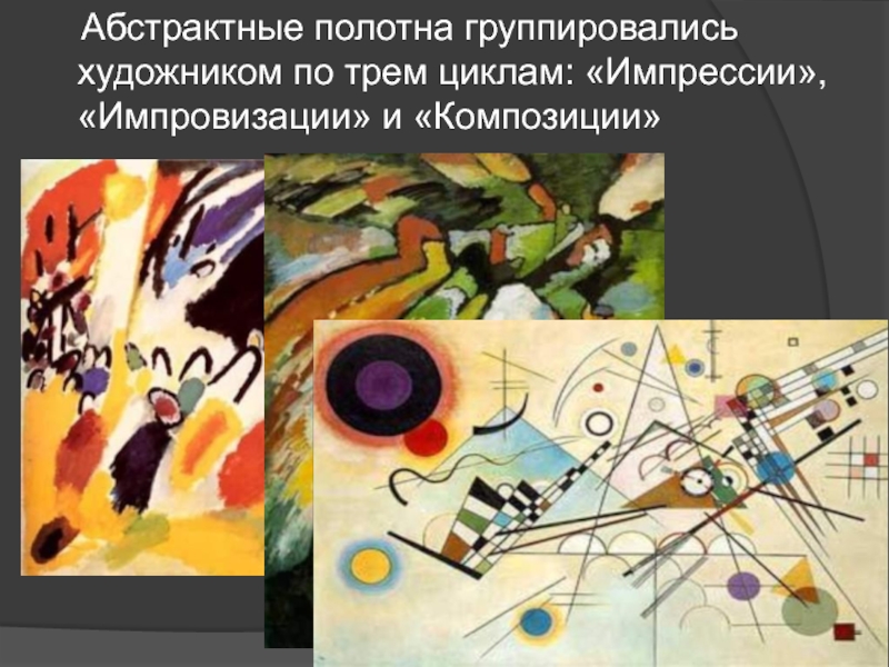 Слайд 5 Абстрактные полотна группировались художником по трем циклам: «Импрессии»,