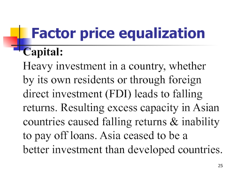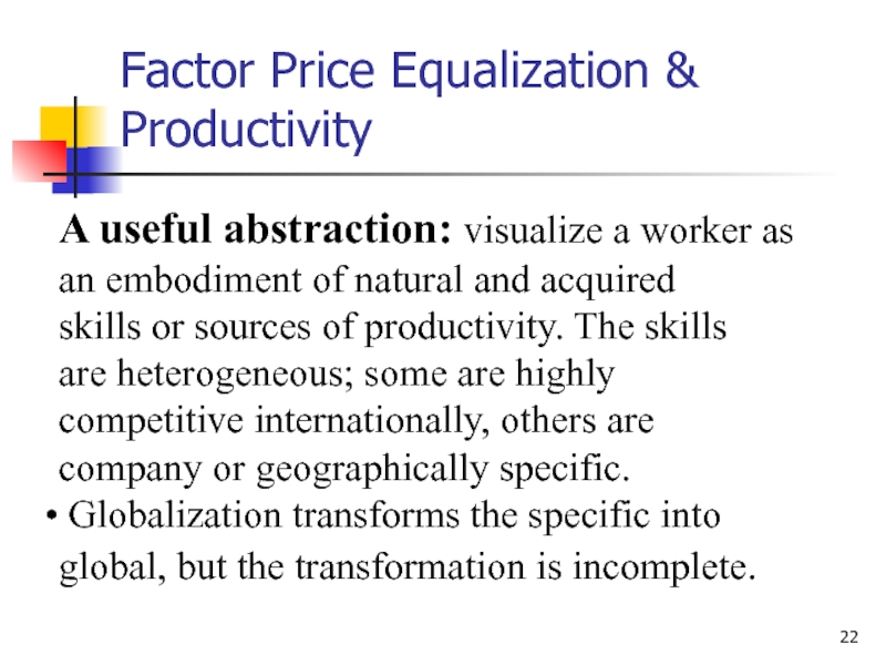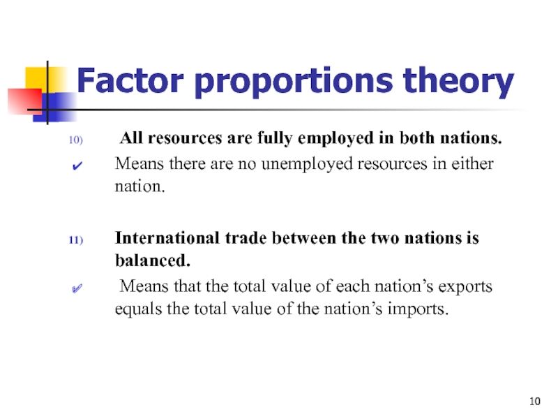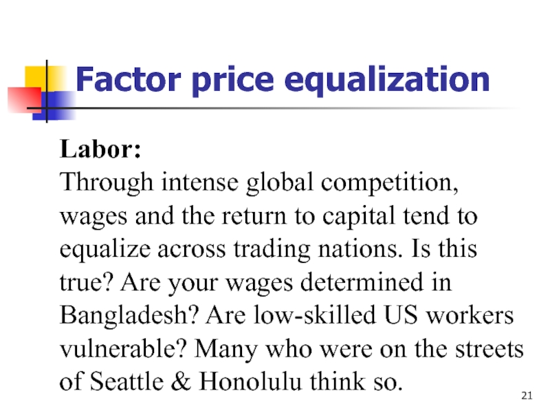 Means K&L are free to move from areas and industries of lower earnings to those of higher earnings until earnings are the same in all areas, uses and industries of the nation. International differences in earnings persist due to zero international factor mobility in the absence of international trade.