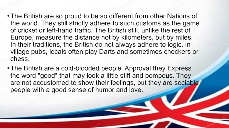 The British are a cold-blooded people. Approval they Express the word "good" that may look a little stiff and pompous. They are not accustomed to show their feelings, but they are sociable people with a good sense of humor and love.
