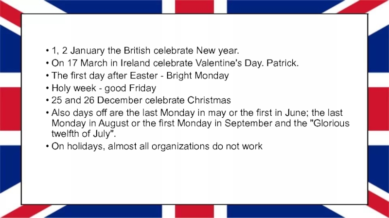 1, 2 January the British celebrate New year.On 17 March in Ireland celebrate Valentine's Day. Patrick.The first