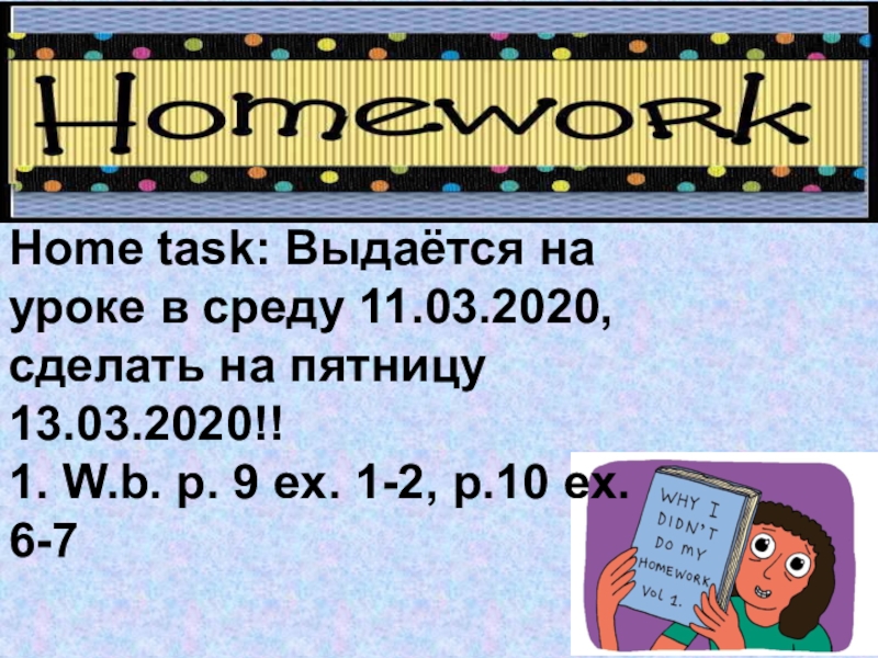 Слайд 4Home task: Выдаётся на уроке в среду 11.03.2020, сделать на