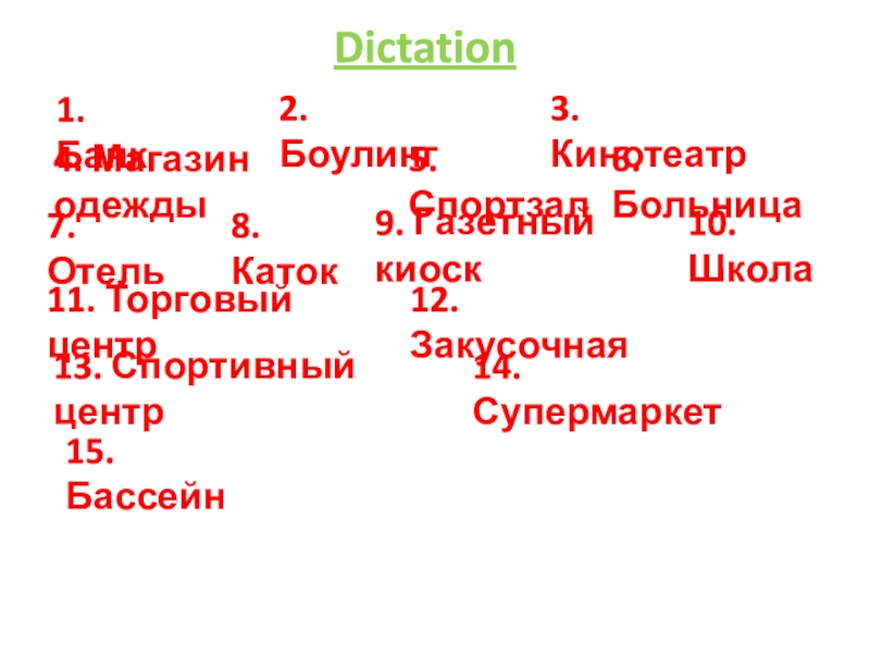 Dictation1. Банк2. Боулинг3. Кинотеатр12. Закусочная4. Магазин одежды5.Спортзал6. Больница7. Отель8.Каток9. Газетный киоск10. Школа11. Торговый центр13. Спортивный центр14. Супермаркет15.