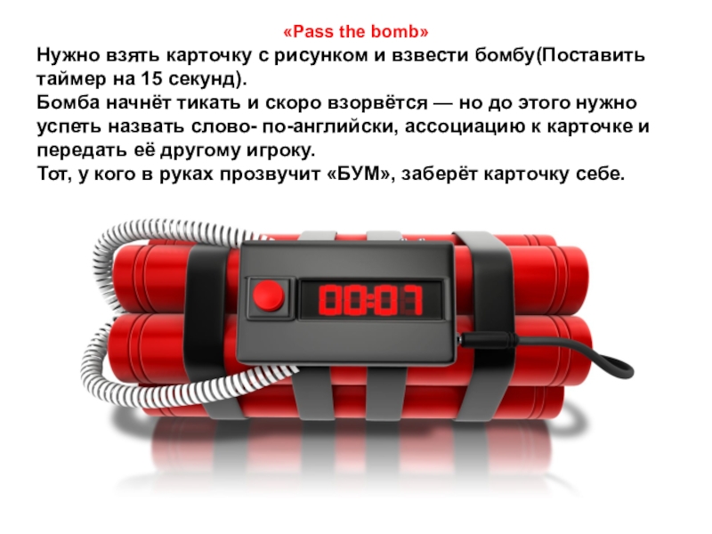 «Pass the bomb»Нужно взять карточку с рисунком и взвести бомбу(Поставить таймер на 15 секунд). Бомба начнёт тикать