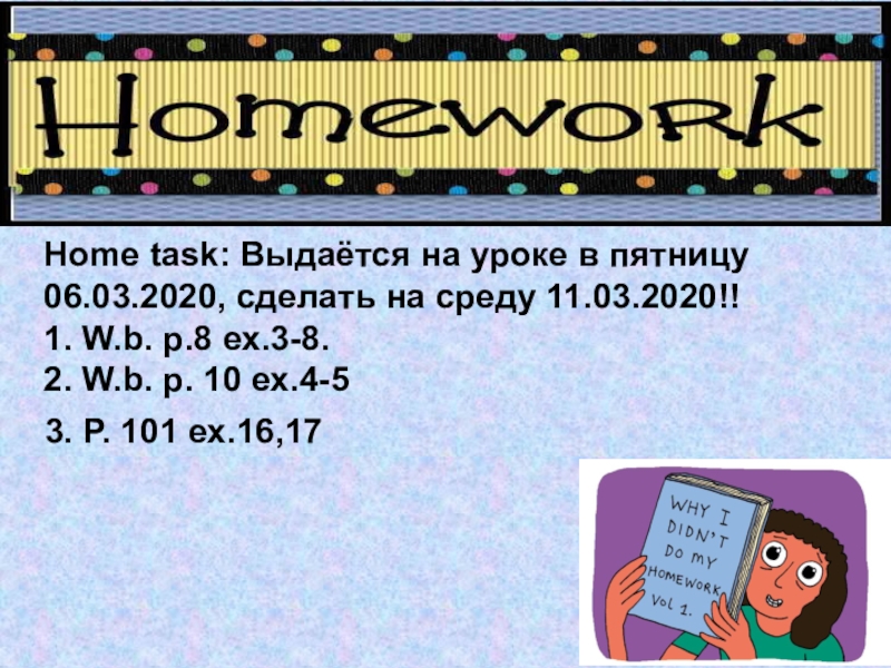 3. P. 101 ex.16,17 Home task: Выдаётся на уроке в пятницу 06.03.2020, сделать на среду 11.03.2020!!