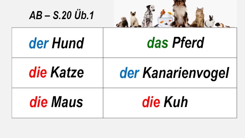 AB – S.20 Üb.1der Hunddie Katzedie Mausdas Pferdder Kanarienvogeldie Kuh