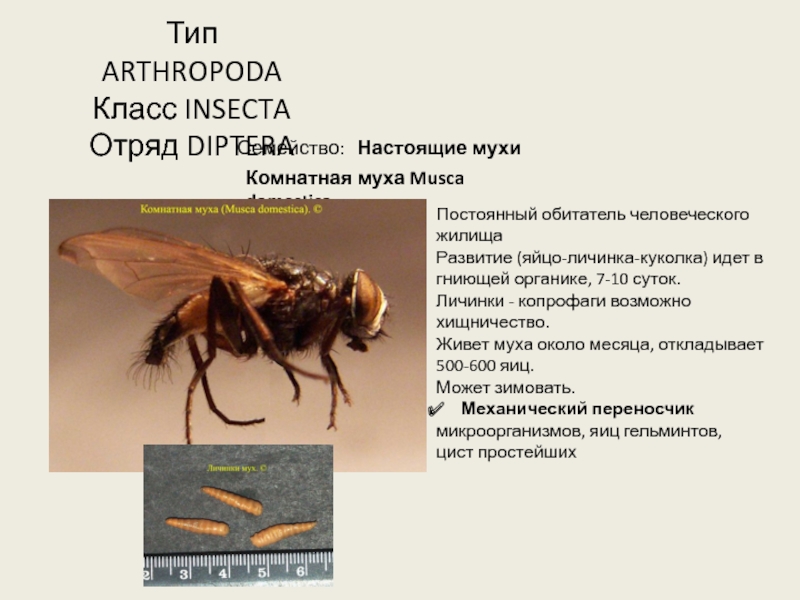 Личинки- облигатные паразиты животных, реже человека. У самки формируется от 100 до 200 личинок, которые откладываются на ссадины, раны, слизистые оболочки животных и человека.
