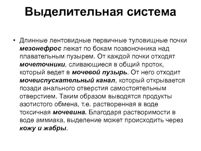 сливающиеся в общий проток, который ведет в мочевой пузырь. От него отходит мочеиспускательный канал, который открывается позади анального отверстия самостоятельным отверстием. Таким образом выводятся продукты азотистого обмена, т.е. растворенная в воде токсичная мочевина. Благодаря растворимости в воде аммиака, выделение может происходить через кожу и жабры.