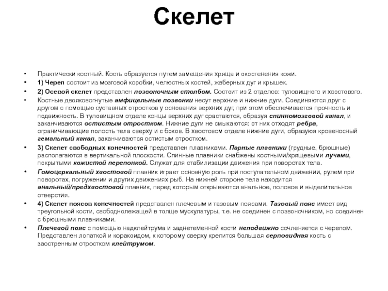 4) Скелет поясов конечностей представлен плечевым и тазовым поясами. Тазовый пояс имеет вид треугольной кости, свободнолежащей в толще мускулатуры, т.е. не соединен с позвоночником, но соединен с брюшными плавниками.