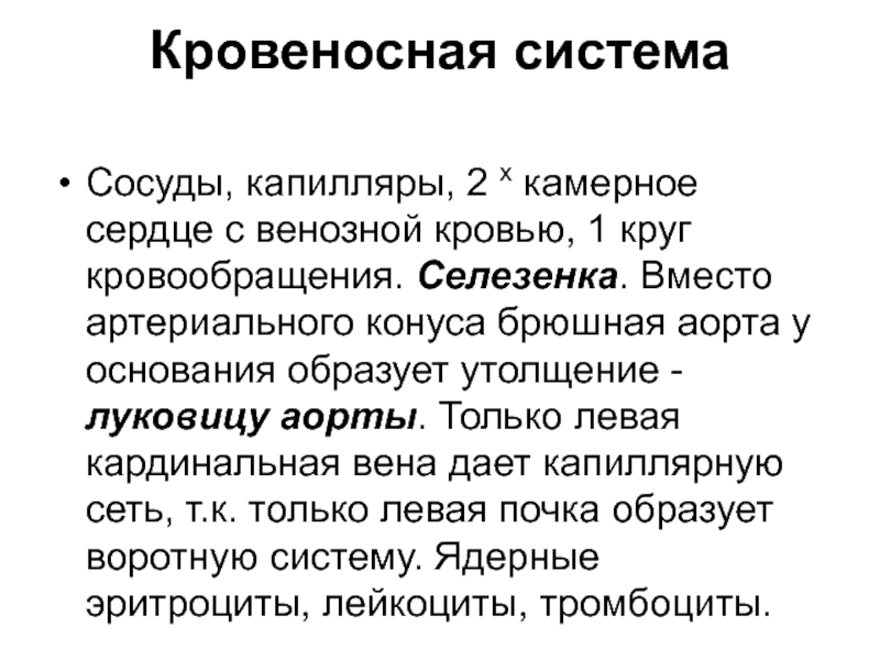 у основания образует утолщение - луковицу аорты. Только левая кардинальная вена дает капиллярную сеть, т.к. только левая почка образует воротную систему. Ядерные эритроциты, лейкоциты, тромбоциты.