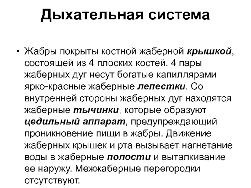 лепестки. Со внутренней стороны жаберных дуг находятся жаберные тычинки, которые образуют цедильный аппарат, предупреждающий проникновение пищи в жабры. Движение жаберных крышек и рта вызывает нагнетание воды в жаберные полости и выталкивание ее наружу. Межжаберные перегородки отсутствуют.