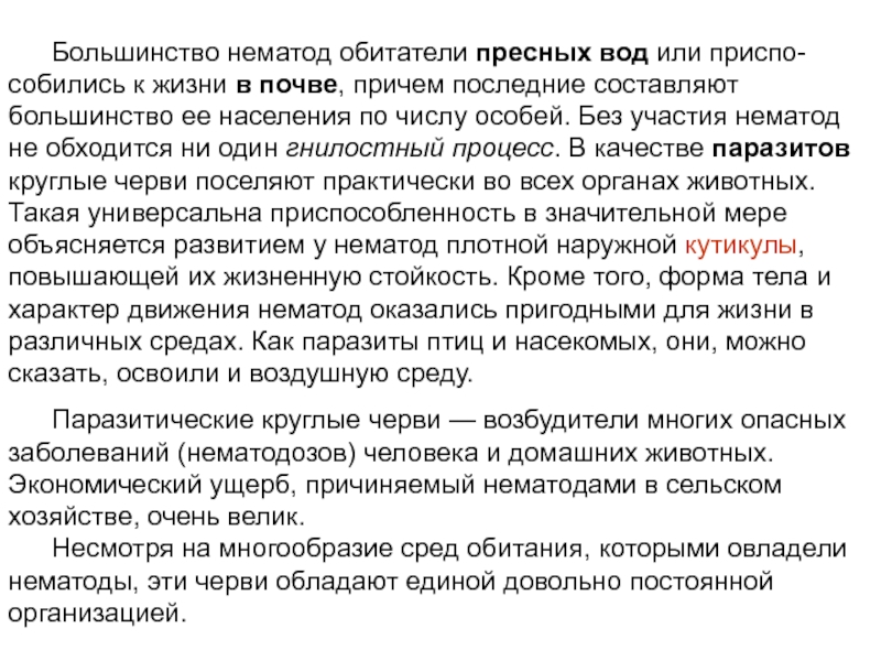 Без участия нематод не обходится ни один гнилостный процесс. В качестве паразитов круглые черви поселяют практически во всех органах животных. Такая универсальна приспособленность в значительной мере объясняется развитием у нематод плотной наружной кутикулы, повышающей их жизненную стойкость. Кроме того, форма тела и характер движения нематод оказались пригодными для жизни в различных средах. Как паразиты птиц и насекомых, они, можно сказать, освоили и воздушную среду.