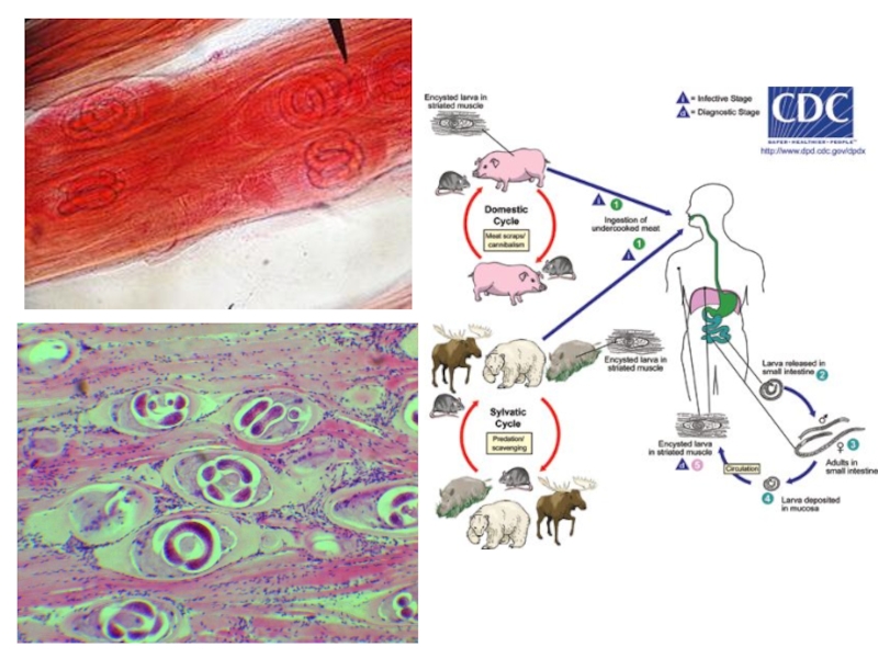 трихинелл. В тонком кишечнике капсулы личинок перевариваются и они выходят в просвет кишечника, через 2—3 суток превращаются в половозрелые формы. Половозрелые трихинеллы живут короткое время: 1—2 недели у человека в тонких кишках, где копулируют. Затем самки внедряются в подслизистую оболочку кишки и отражают мелких личинок. Личинки током крови и лимфы разносятся по всему организму и задерживаются только в скелетной мускулатуре - проникают в мышечные волокна и сворачиваются в спираль. В капсуле личинки сохраняют жизнеспособность до 20—25 лет. Они стойки к вредным внешним воздействиям и даже в гниющем мясе выживают 2—3 месяца. Для превращения личинок в половозрелую форму они должны попасть в кишечник другого хозяина. Трихинеллы способны паразитировать у всех млекопитающих, но в естественных условиях — преимущественно у плотоядных и всеядных (свиньи, кабаны, кошки, собаки, мыши, крысы, медведи, лисицы и др.).
