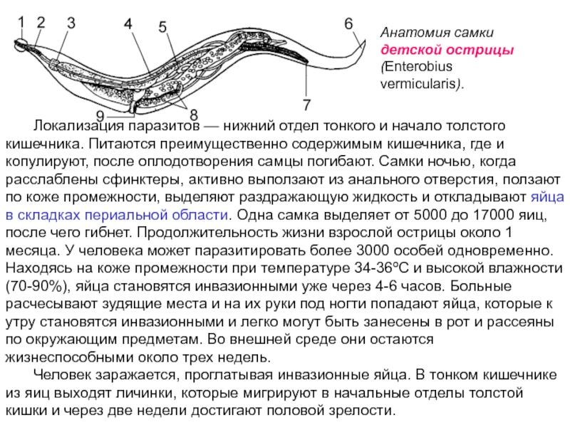 где и копулируют, после оплодотворения самцы погибают. Самки ночью, когда расслаблены сфинктеры, активно выползают из анального отверстия, ползают по коже промежности, выделяют раздражающую жидкость и откладывают яйца в складках периальной области. Одна самка выделяет от 5000 до 17000 яиц, после чего гибнет. Продолжительность жизни взрослой острицы около 1 месяца. У человека может паразитировать более 3000 особей одновременно. Находясь на коже промежности при температуре 34-36ºС и высокой влажности (70-90%), яйца становятся инвазионными уже через 4-6 часов. Больные расчесывают зудящие места и на их руки под ногти попадают яйца, которые к утру становятся инвазионными и легко могут быть занесены в рот и рассеяны по окружающим предметам. Во внешней среде они остаются жизнеспособными около трех недель.