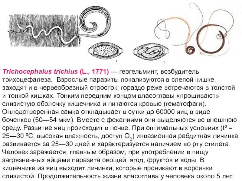 Слайд 6Trichocephalus trichius (L., 1771) — геогельминт, возбудитель трихоцефалеза. Взрослые паразиты