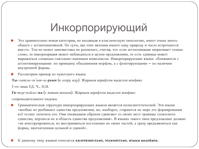 К данному типу языков относятся палеоазиатские, эскимосские, языки индейцев.