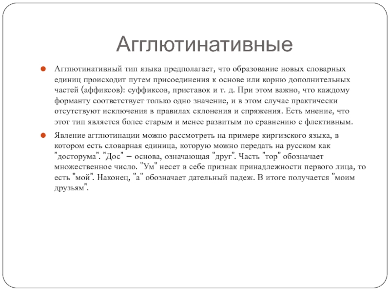 приставок и т. д. При этом важно, что каждому форманту соответствует только одно значение, и в этом случае практически отсутствуют исключения в правилах склонения и спряжения. Есть мнение, что этот тип является более старым и менее развитым по сравнению с флективным.
