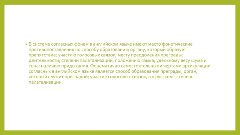 связок; месту преодоления преграды; длительности; степени палатализации, положению языка; удельному весу шума и тона; наличию придыхания. Фонематично самостоятельными чертами артикуляции согласных в английском языке является способ образования преграды; орган, который служит преградой; участие голосовых связок, а в русском - степень палатализации.